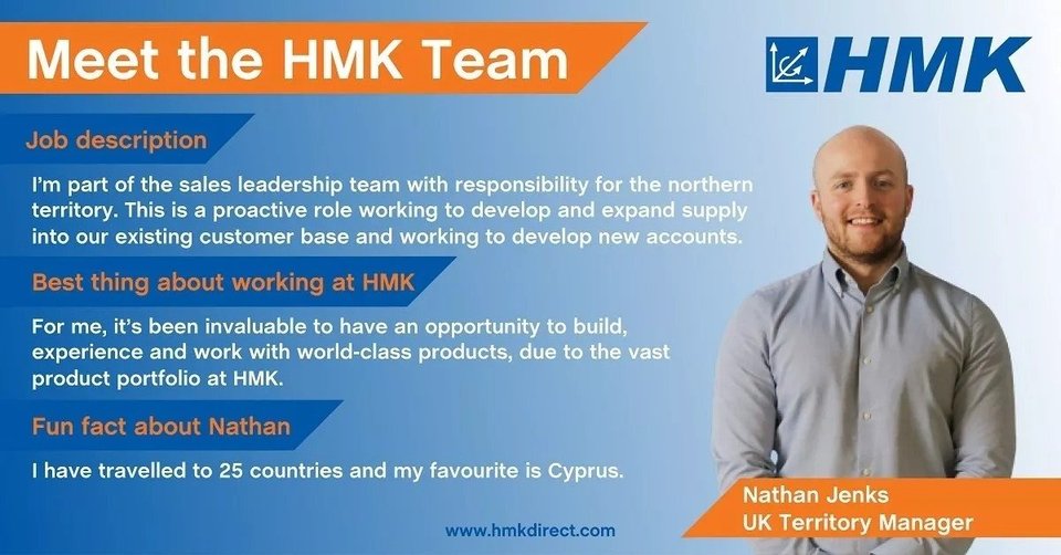 Patrick Tongs, Sales Director at HMK, said: “People mean everything at HMK and their development is paramount. Nathan joined the business two years ago, bringing with him international face-to-face technical sales experience and a clear desire for progression.