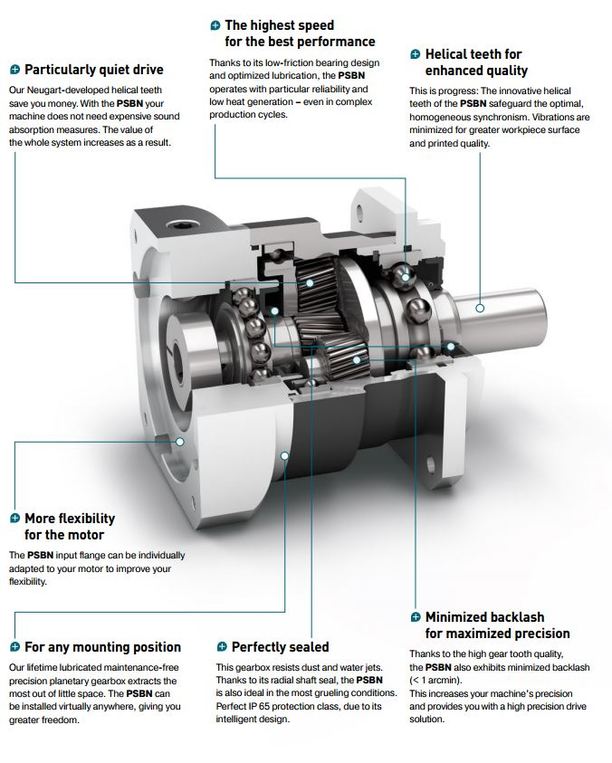 Helical Gears reduce noise, increase smoothness of running and due to the gradual engagement of the teeth the output speed is more closely synchronised with the motor than with straight gears. Note, the SP high speed friction optimised gearbox uses straight gears so the PSBN would be quieter..