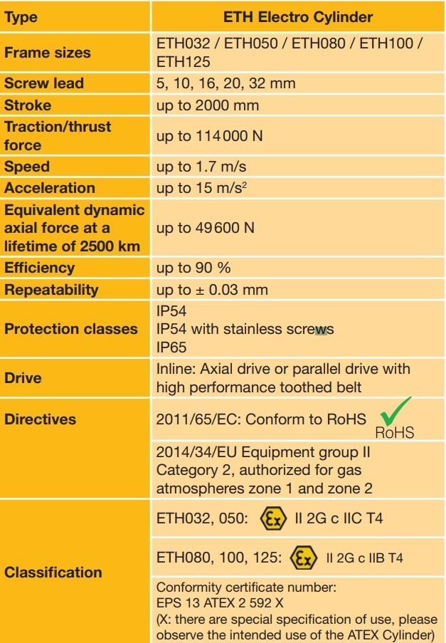 The ETH electro cylinder closes the gap between pneumatic and hydraulic actuators; it can act as a suitable alternative to both in many applications and can have the added benefit of increasing the reliability of the production process. Taking the costs for air and oil into consideration, you will find that in most cases an electromechanical system such as the ETH electro cylinder offers the more economical solution. Combined with a wide choice of accessories, the ETH becomes a highly customisable solution, suitable for a variety of applications.