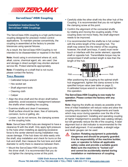 Misalignment capability of a coupling is also important in a servo motion control system. Usually, the alignment of a well manufactured servo system will be very good. Over time and under high load conditions, this alignment may deteriorate. The coupling should be capable of handling this change. Also, the coupling should accommodate any lack of concentricity in the connected shafts as well as the stack up of tolerances in the motion assembly. Another important benefit of a high misalignment capability is the dispersion of reaction loads on the bearings and bushings in the system. The Zero-Max servo motor coupling utilises a design that provides adequate amounts of flexibility but does not sacrifice any of the torque capability or the torsional stiffness capability and therefore minimises the reaction loads to the servo motor bearings.