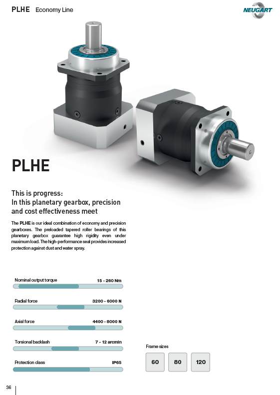 The PLHE is the world’s first combination of economy and precision planetary gearboxes. The prestressed tapered roller bearings of our planetary gearboxes safeguard great stiffness even under the highest loads. The seal we have developed provides the perfect protection against dust and water jets.