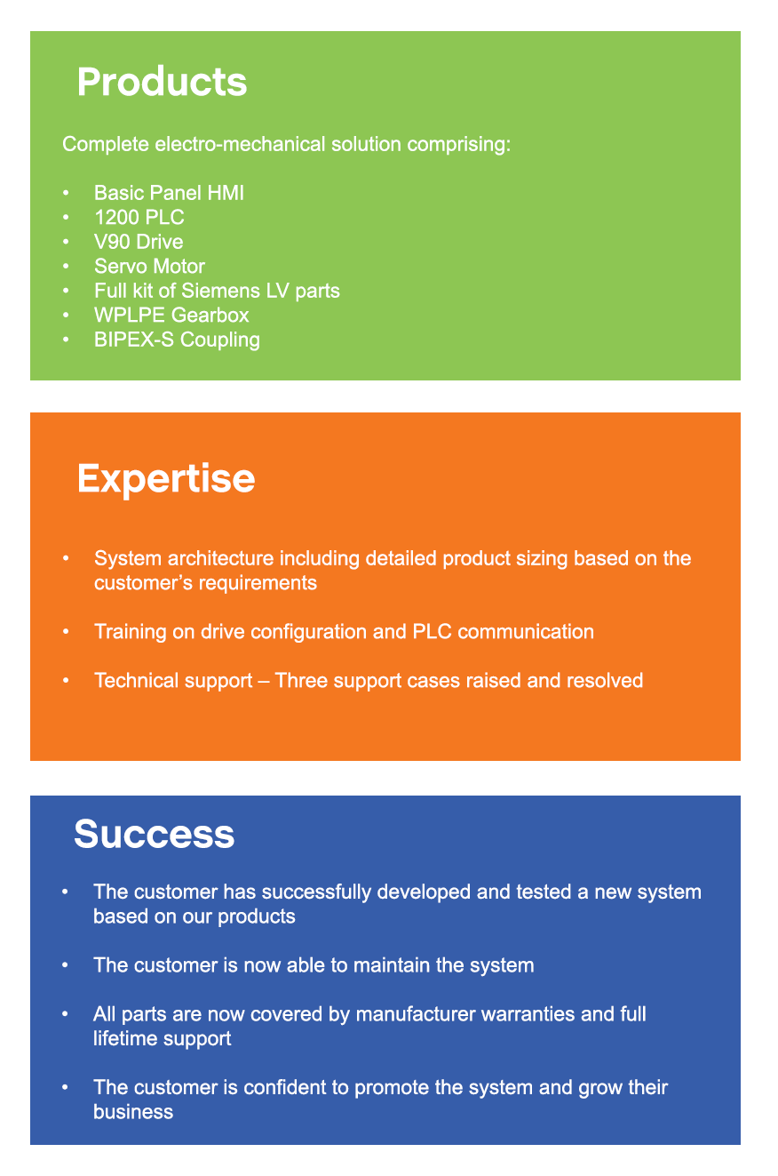 Along with providing integral products to the customer’s system - HMK also supplied their expertise and training on drive configuration & PLC communication as well as technical support; with three support cases raised and resolved at present.
