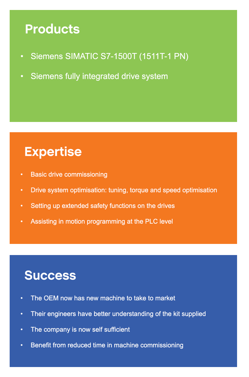 Whilst supplying our motion and control expertise from experience gained over a combined 300 years, along with in-depth product and application knowledge, a number of onsite meetings took place at the customer’s establishment in Accrington. As a result, a thorough understanding of the customer’s requirement was realised, allowing HMK to size and select the correct products accompanied by precise expertise, leading to success. Among the products which were selected, a Siemens SIMATIC S7-1500T (1511T-1 PN) was used. This enabled the customer to use electrically generated CAM profiles as well as electrical synchronisation between the two axes.